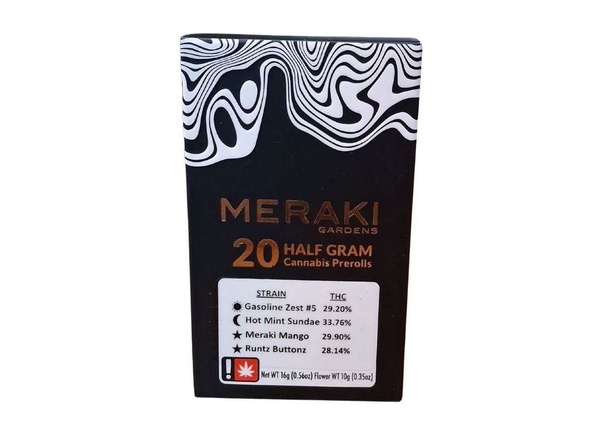 A few products consistently show up across the most locations. MERAKI - VARIETY PACK - 0.5G - 20PK - BLUEBERRY HEADBAND / RED BULLZ / STUDIO 54 / SWISS WATCH (11 stores), Beach Grapes #12 1G Preroll (9 stores), and Gas Berry | Meraki Gardens - 7g (8 stores). Meraki Gardens has built a broad multi-state presence. Available at 182 dispensaries across Colorado and Oregon. The catalog skews heavily toward flowers. Offerings include 1973 flowers, 1157 pre-rolls, 15 edibles, and 7 concentrates. Pricing lands in the premium range for cannabis products. Products run from $2.00 to $760.00.